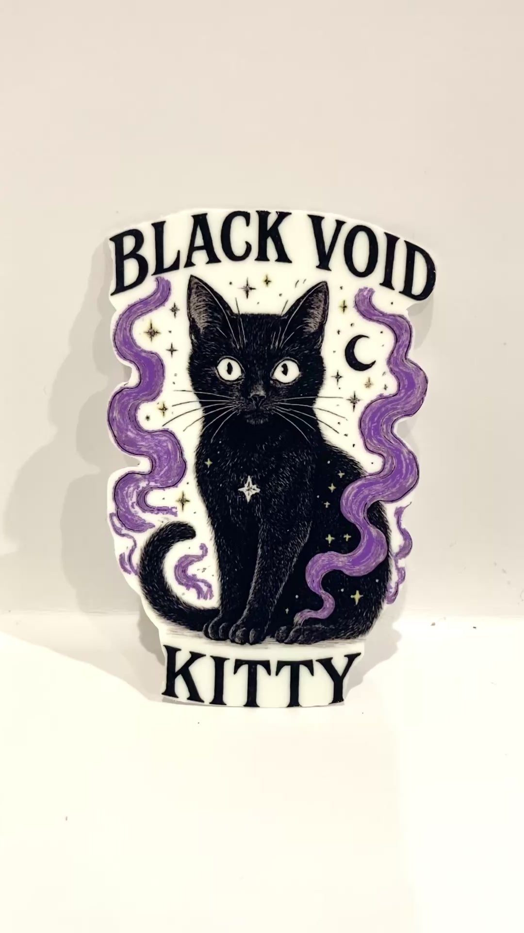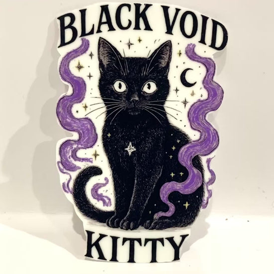 Step into the shadows with our little "Black Void Kitty," part of our Mystical Pets series. This sticker features an enchanting young black cat with luminous golden eyes, surrounded by swirling purple smoke and delicate starlight.