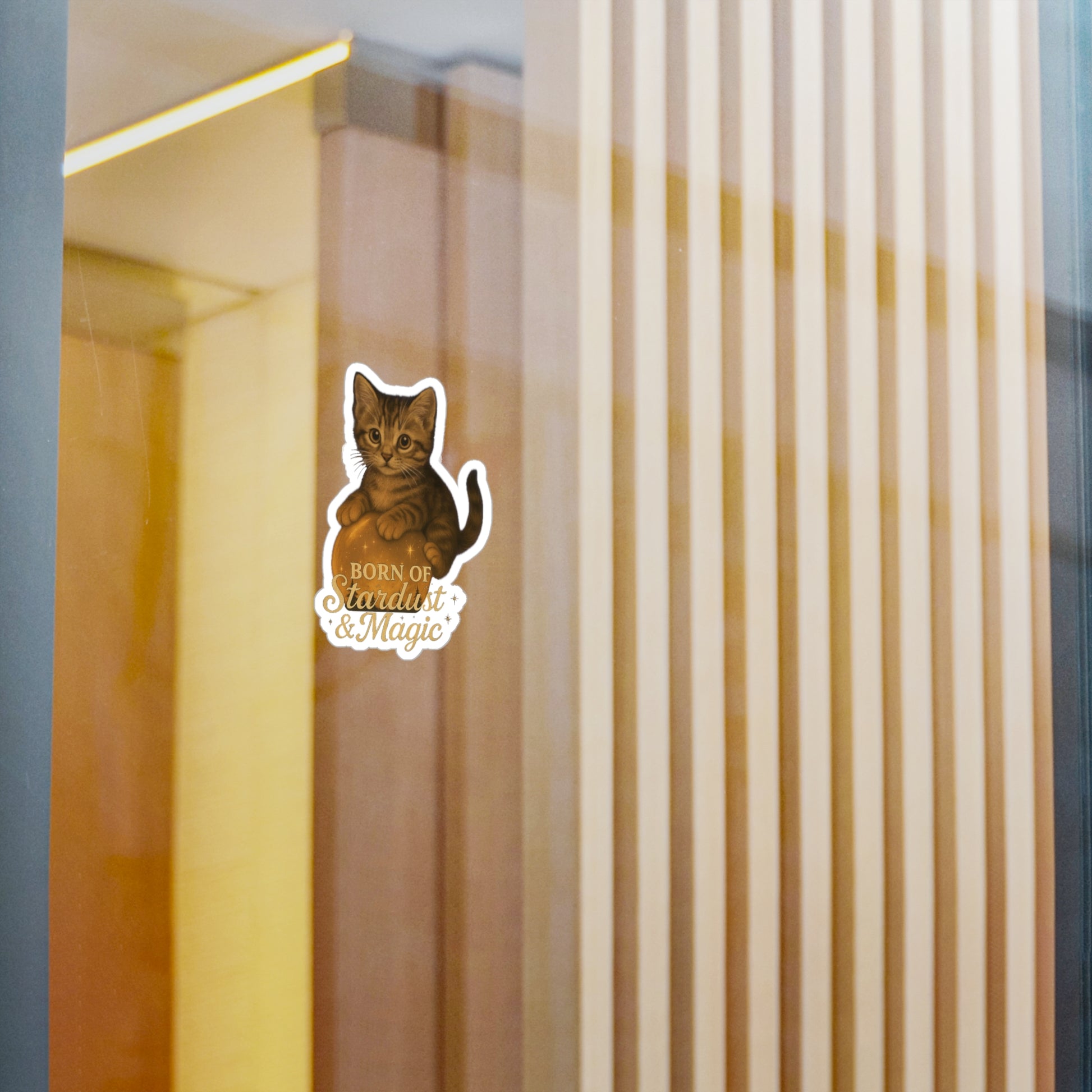 This sweet kitten sticker is part of our Mystical Pets series, offering a whimsical, peaceful addition to any space or item. This golden-eyed tabby kitten, modeled off our beloved mascot kitty Dawn, sits proudly atop a shimmering celestial orb, surrounded by twinkling stars and glowing light. With the phrase "Born of Stardust & Magic" nestled below, this sticker captures a sense of wonder and whimsy that’s perfect for dreamers, stargazers, and cat lovers alike.