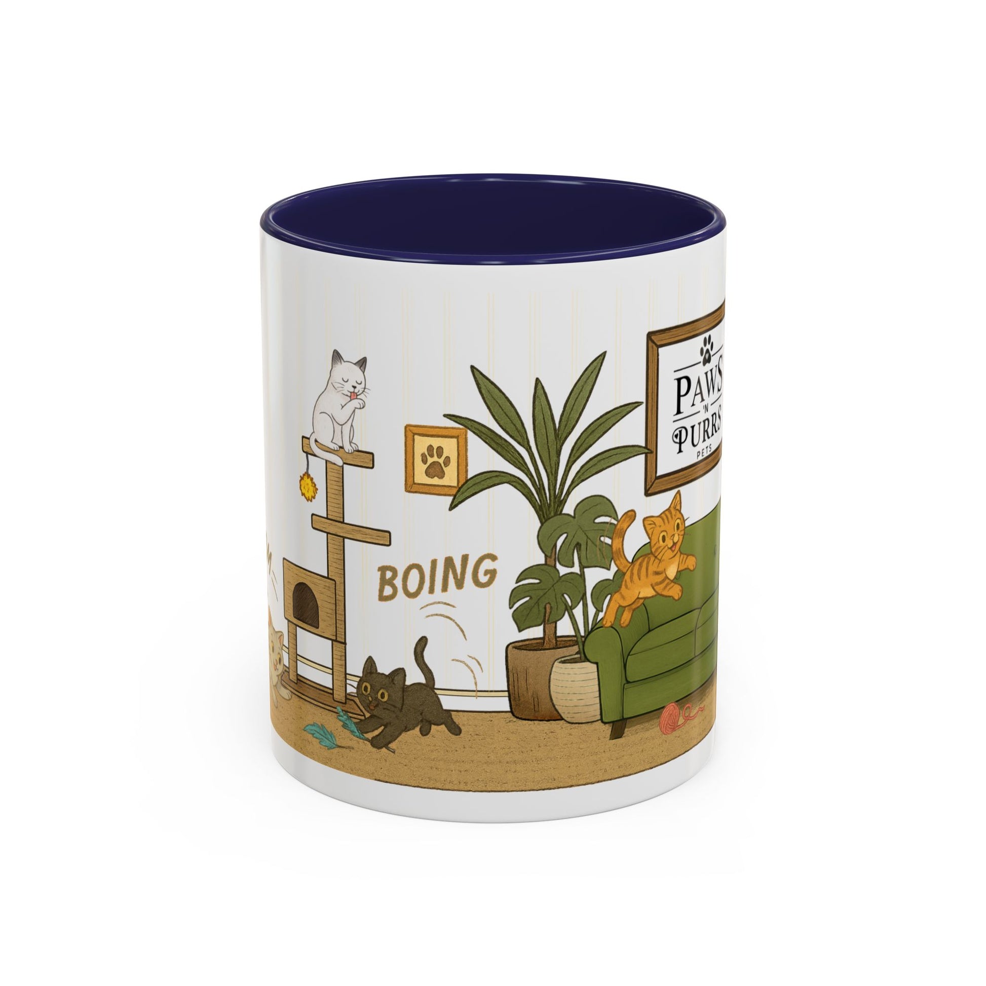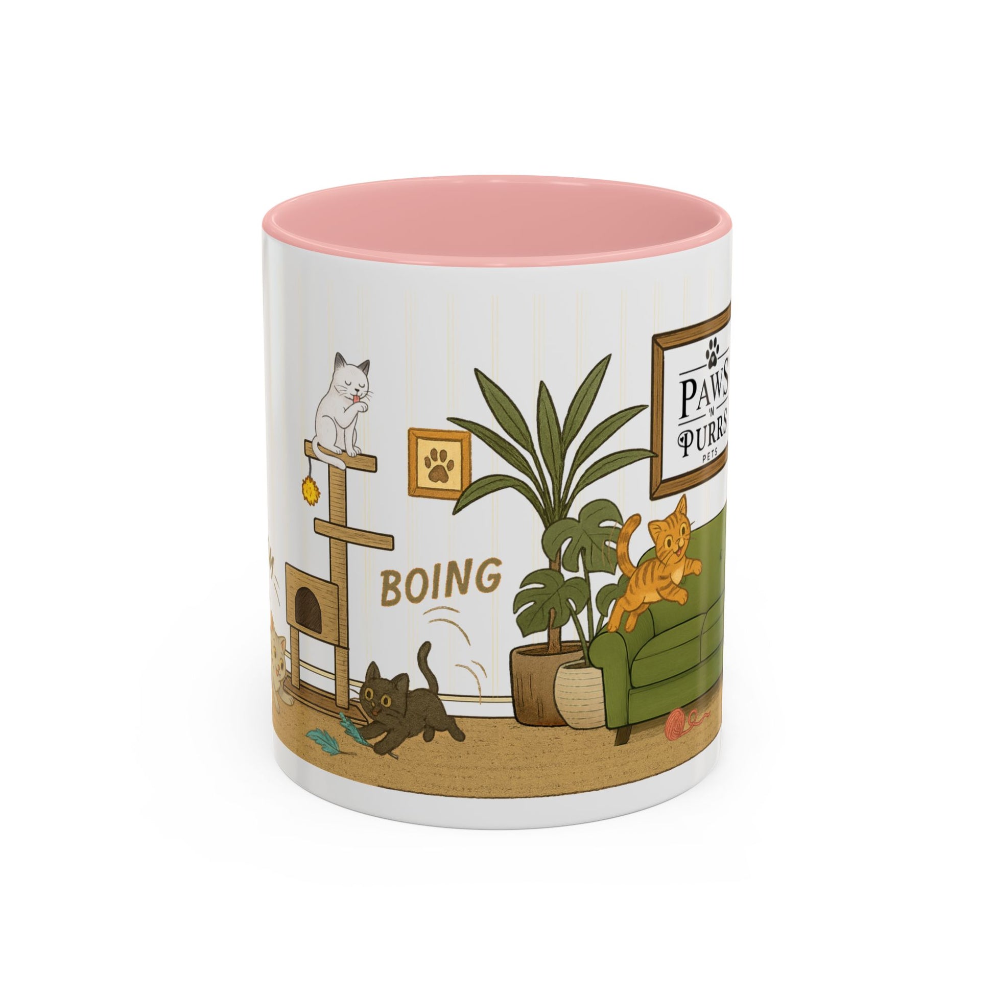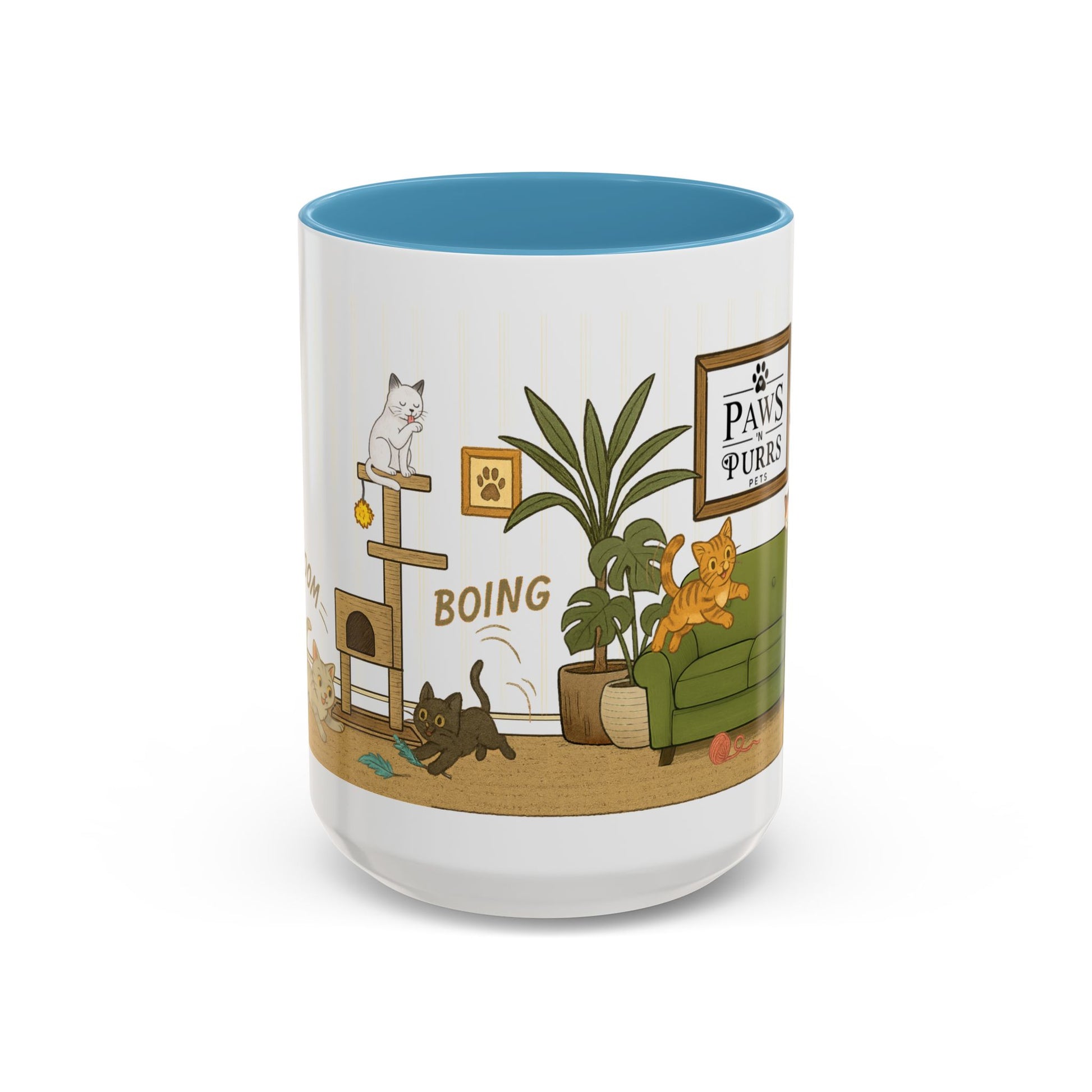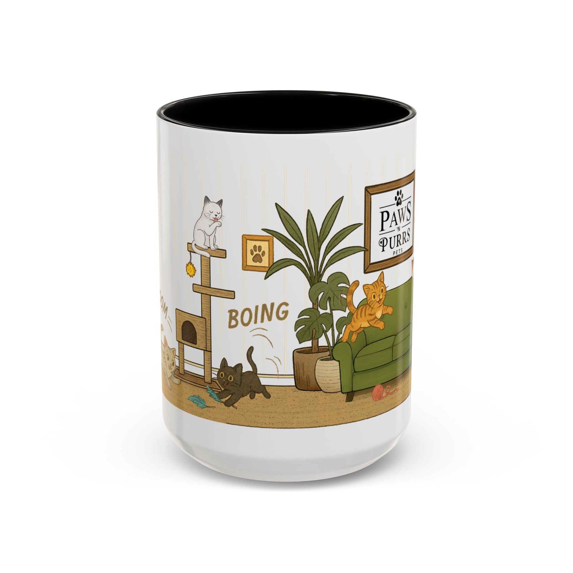 Bring some feline-powered fun to your drink routine with this playful accent mug featuring our Cat House Zoomies design. A lively wrap of energetic cats captures the chaotic charm of indoor zoomies, bringing a smile with every sip.