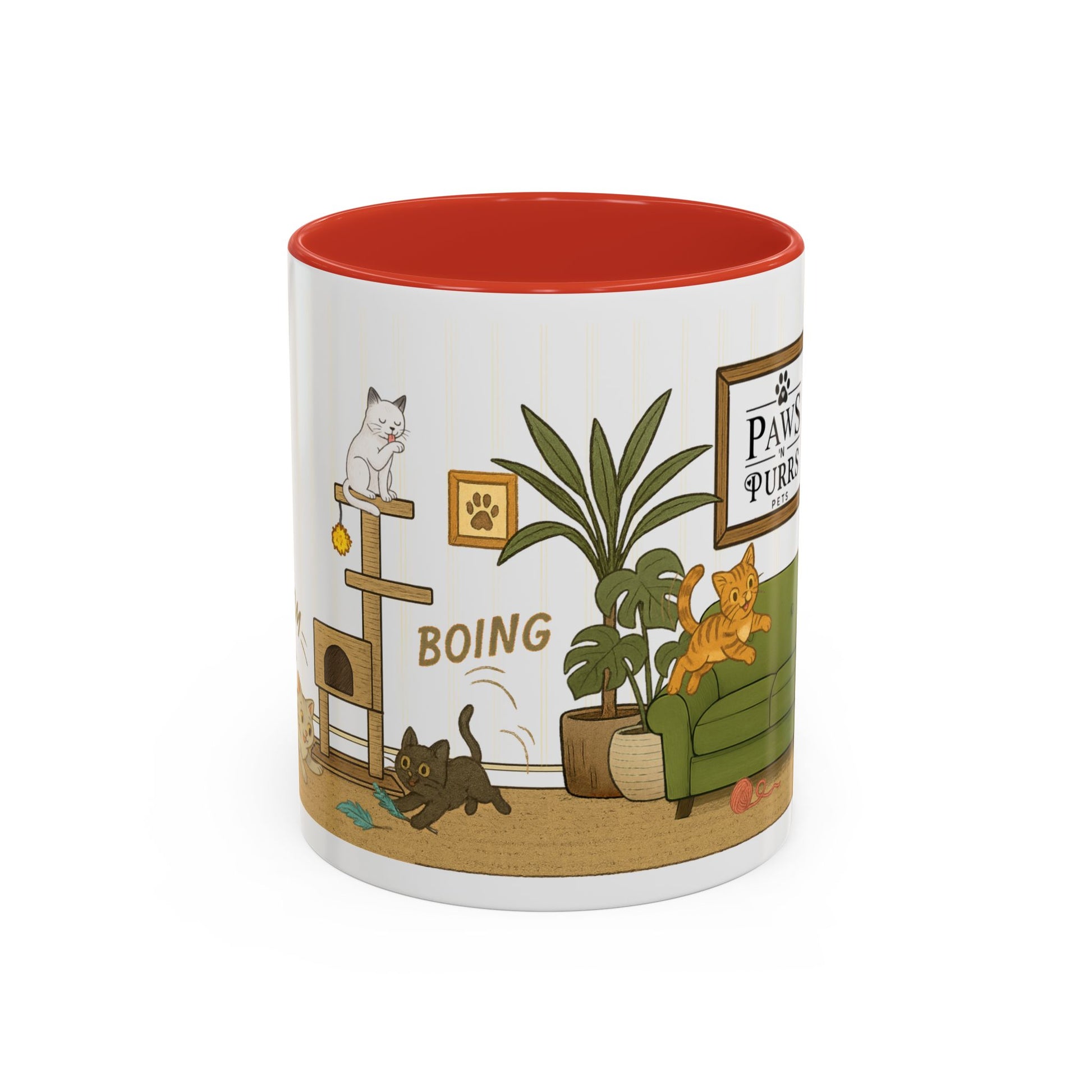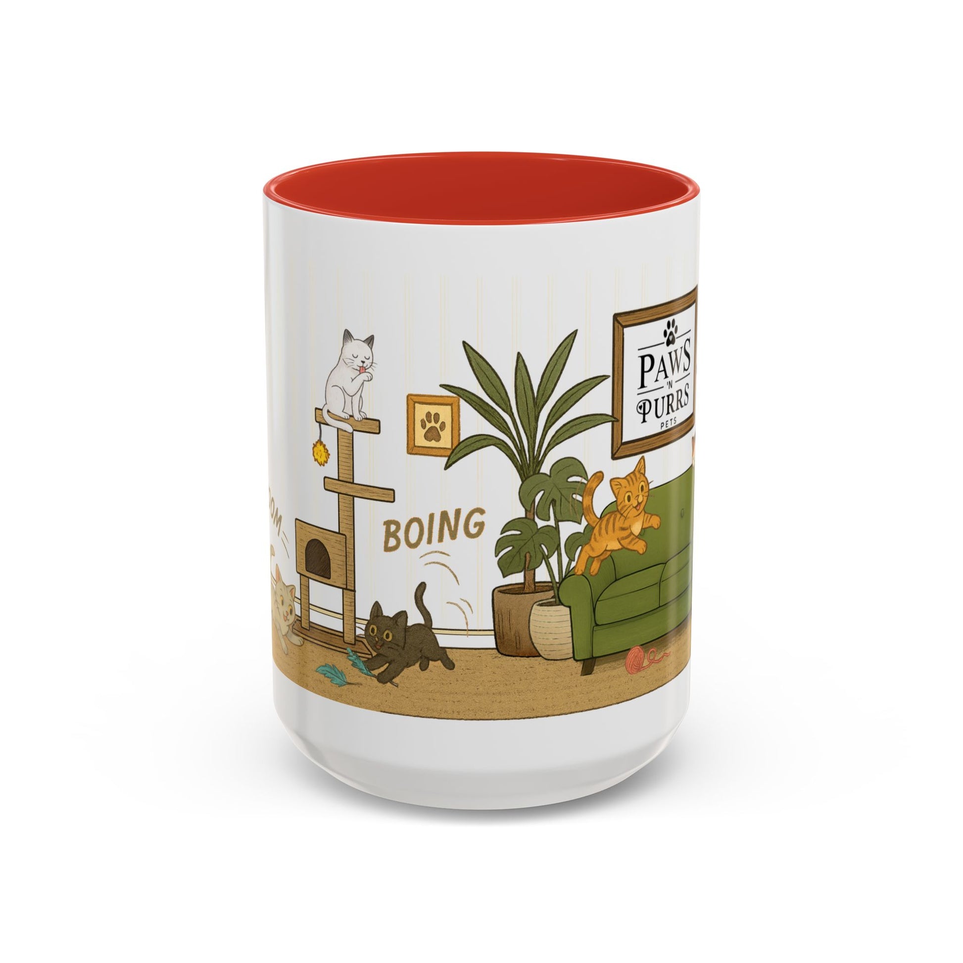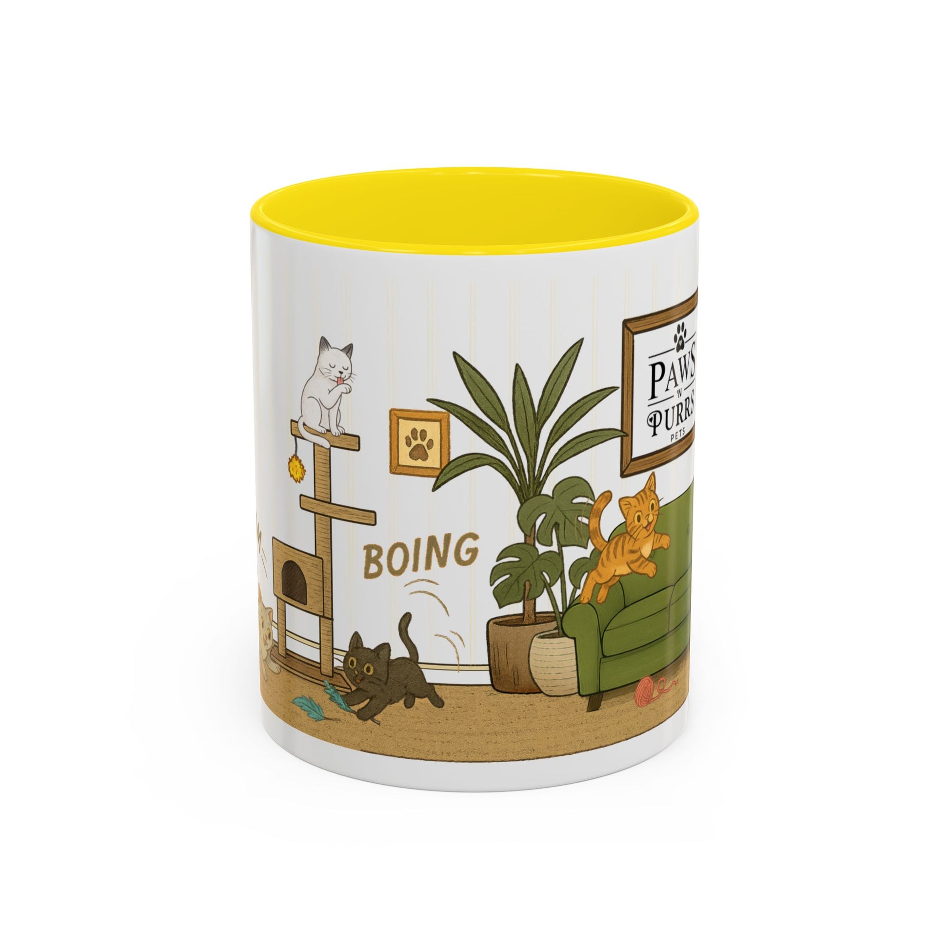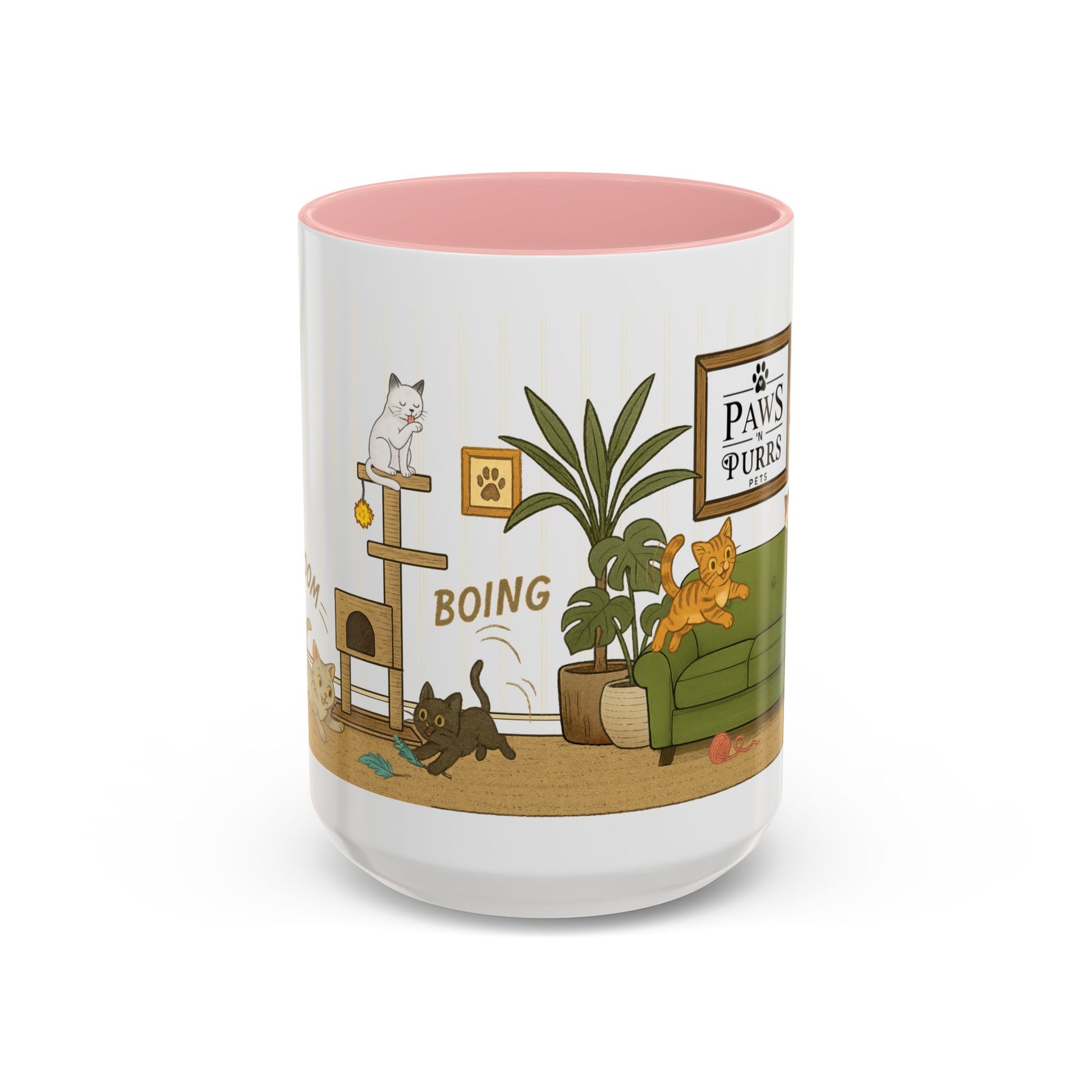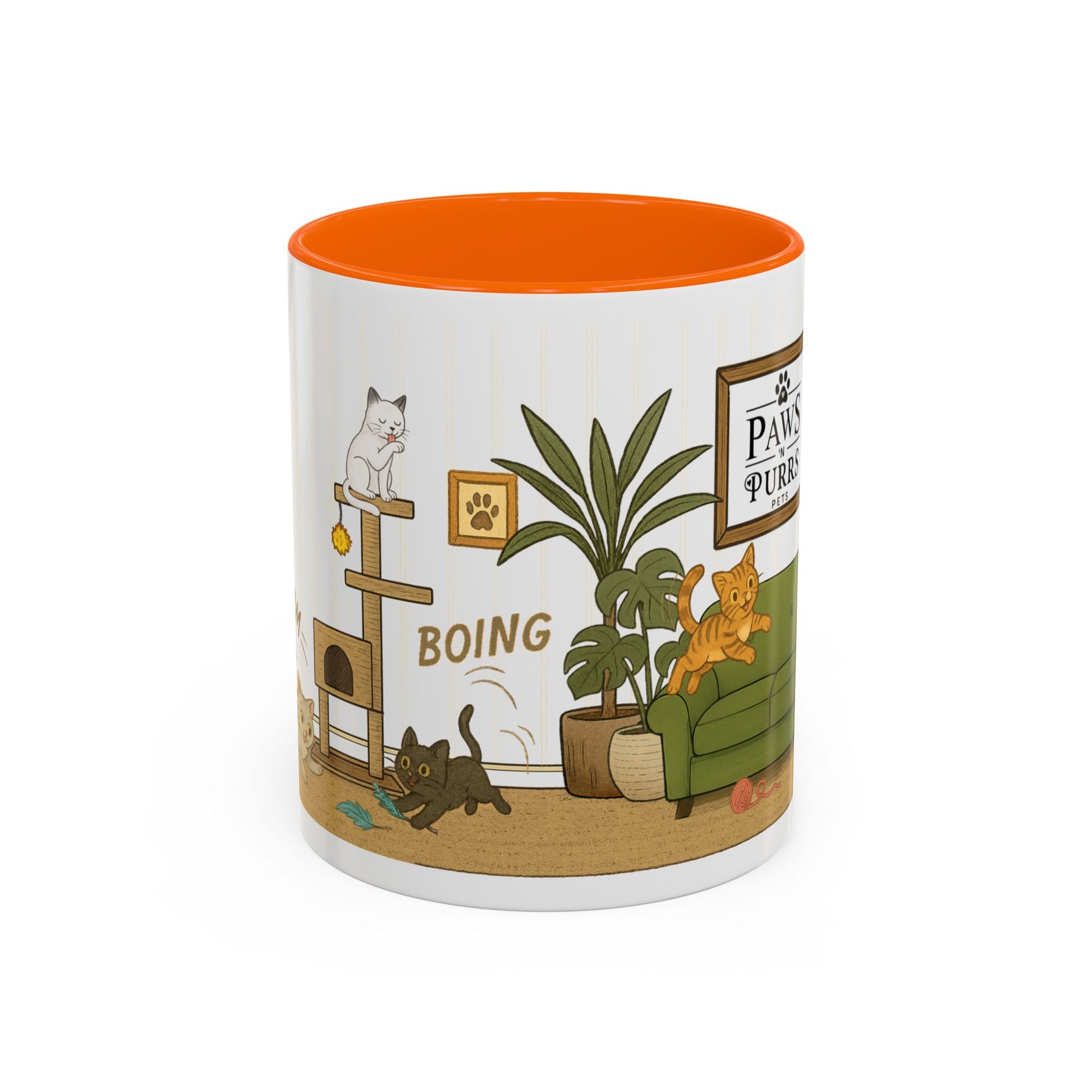 Bring some feline-powered fun to your drink routine with this playful accent mug featuring our Cat House Zoomies design. A lively wrap of energetic cats captures the chaotic charm of indoor zoomies, bringing a smile with every sip.