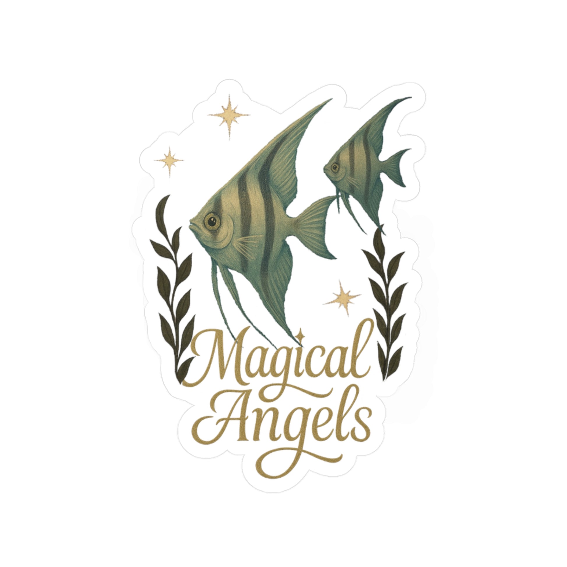 This unique angel fish sticker is part of our Mystical Pets series, offering a whimsical, peaceful addition to any space or item. Graceful and serene, this sticker showcases a pair of celestial angelfish gliding through a dreamy aquatic scene. Framed by delicate leaves and glimmering stars, the soft vintage palette and elegant "Magical Angels" script make it a standout for any fish keeper, aquascaping fan, or underwater dreamer. A perfect little tribute to the quiet beauty of your favorite finned companions.