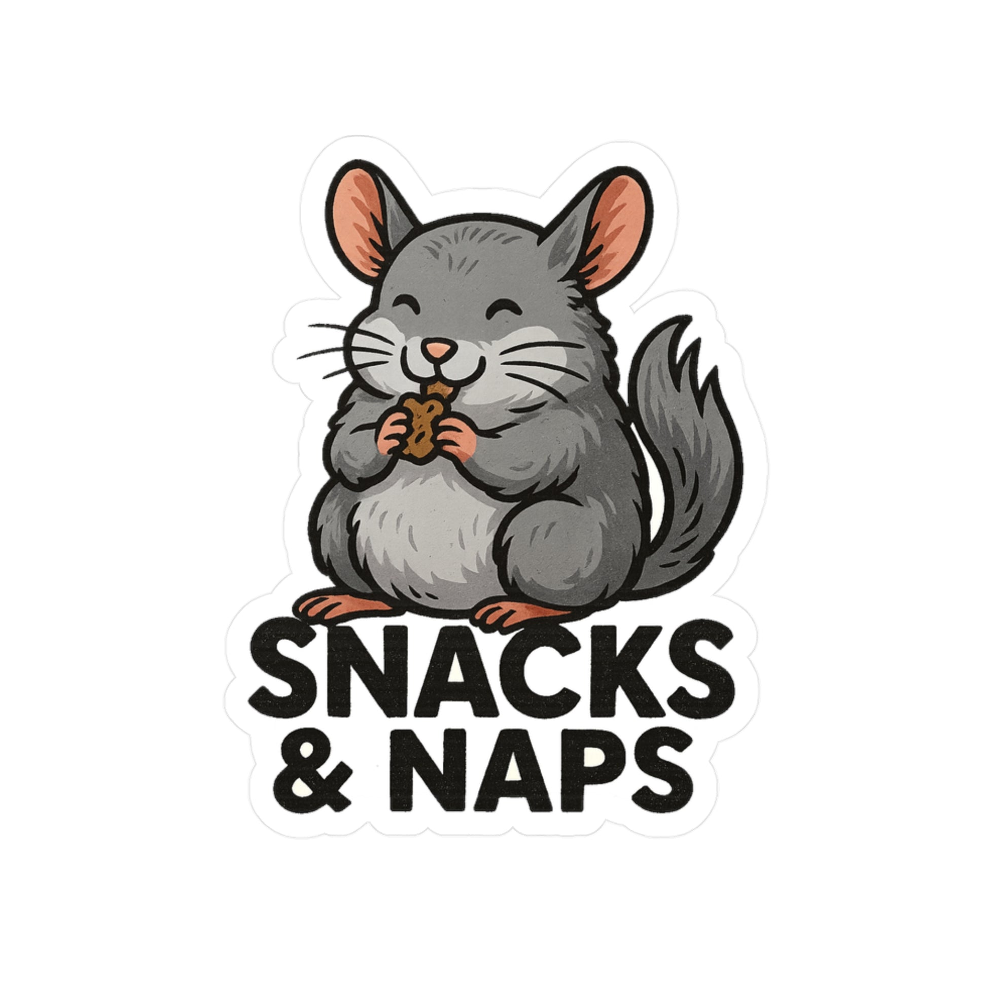 Celebrate the simple joys of life with this irresistibly cute "Snacks & Naps" chinchilla sticker. Featuring a happy chinchilla munching on a snack with pure bliss, this design captures the ultimate mood for small pet lovers and chill-at-heart humans alike.
