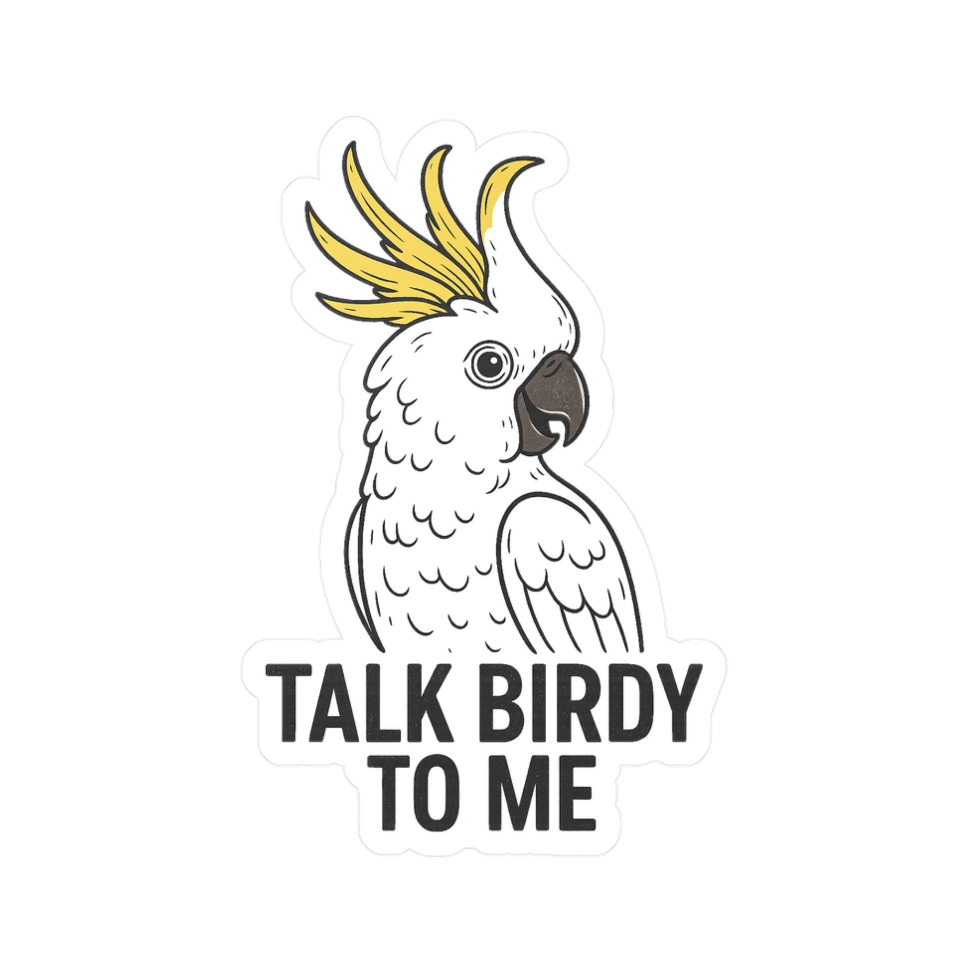 Turn up the charm and the volume with this playful "Talk Birdy to Me" cockatoo sticker. Featuring a bold and expressive cockatoo with a fabulous yellow crest, this design is perfect for bird parents who know their feathered companions have a lot to say.